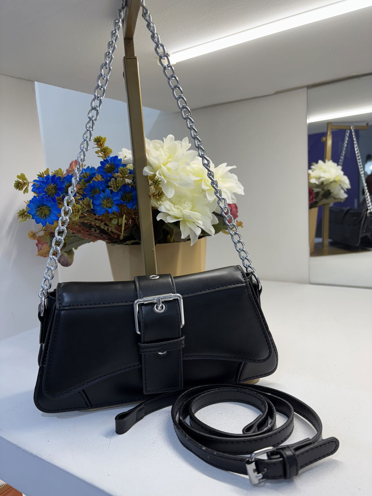 2 correas, la podes utilizar al hombro o alargada.